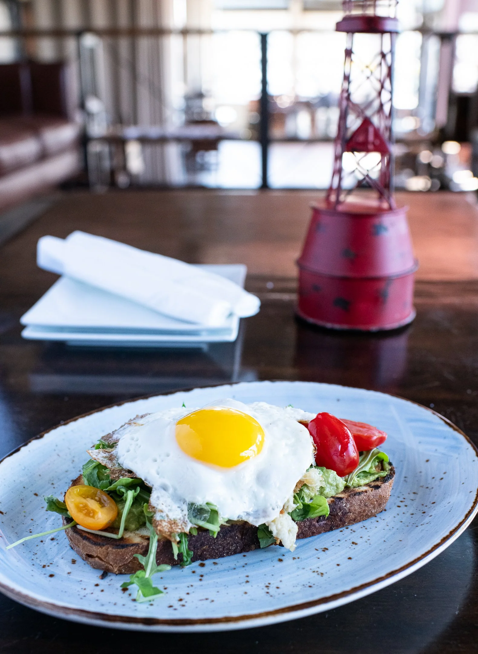 grilled sourdough, avocado mash, arugula, heirloom cherry tomatoes, sunny-side-up egg